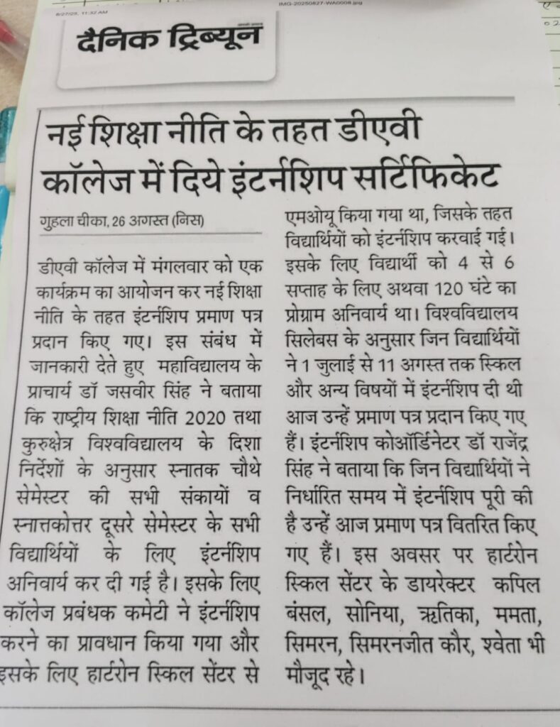 डी .ए .वी कालेज चीका मे नई शिक्षा नीति के तहत विद्यार्थियों को दिये इंटर्नशिप सर्टिफिकेट